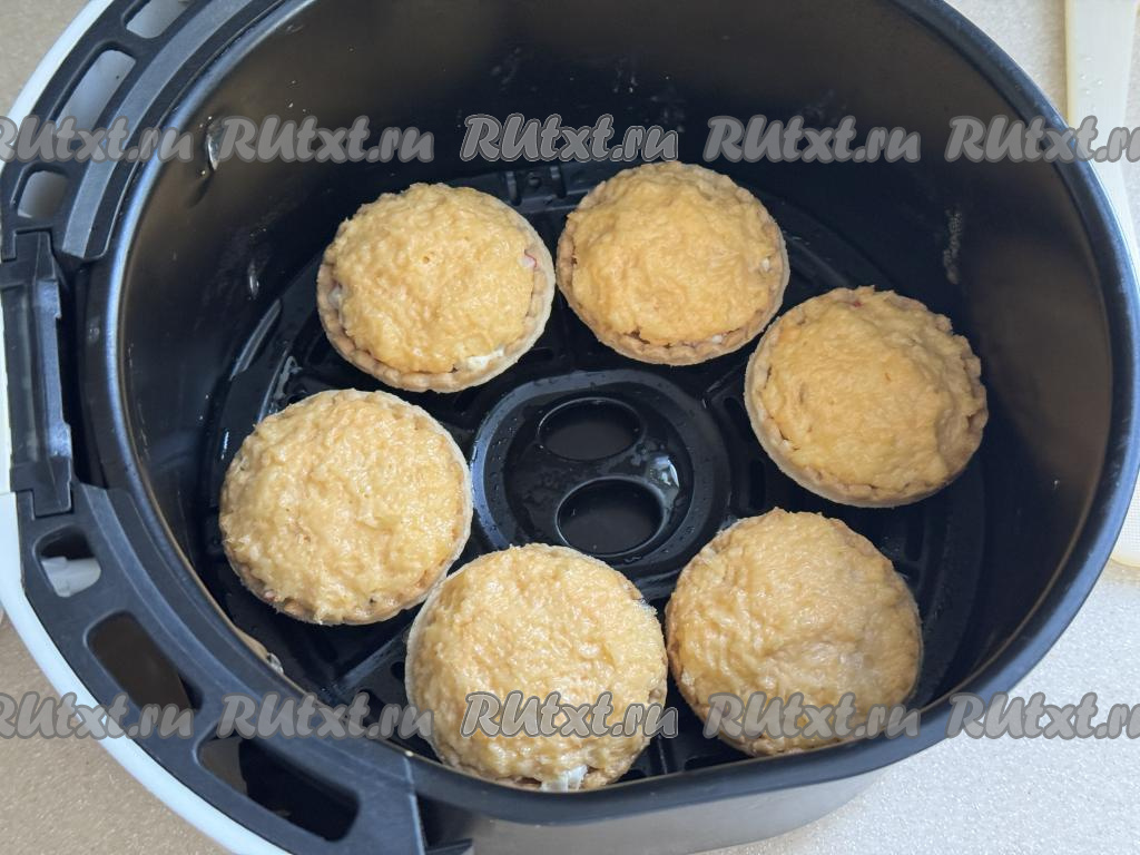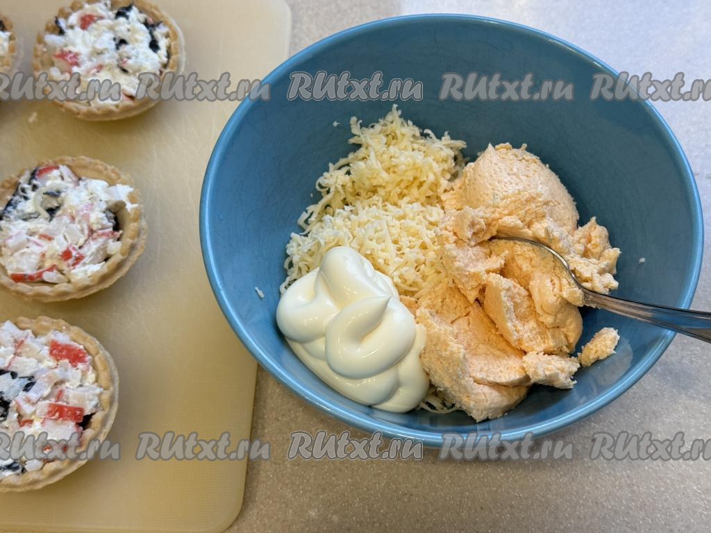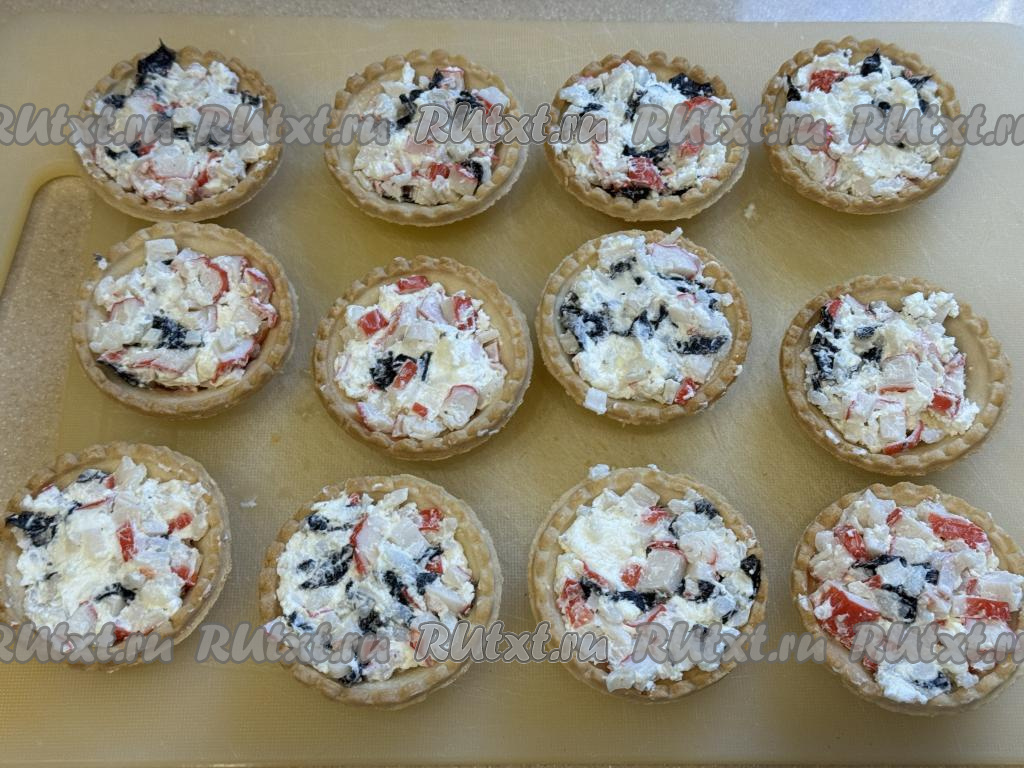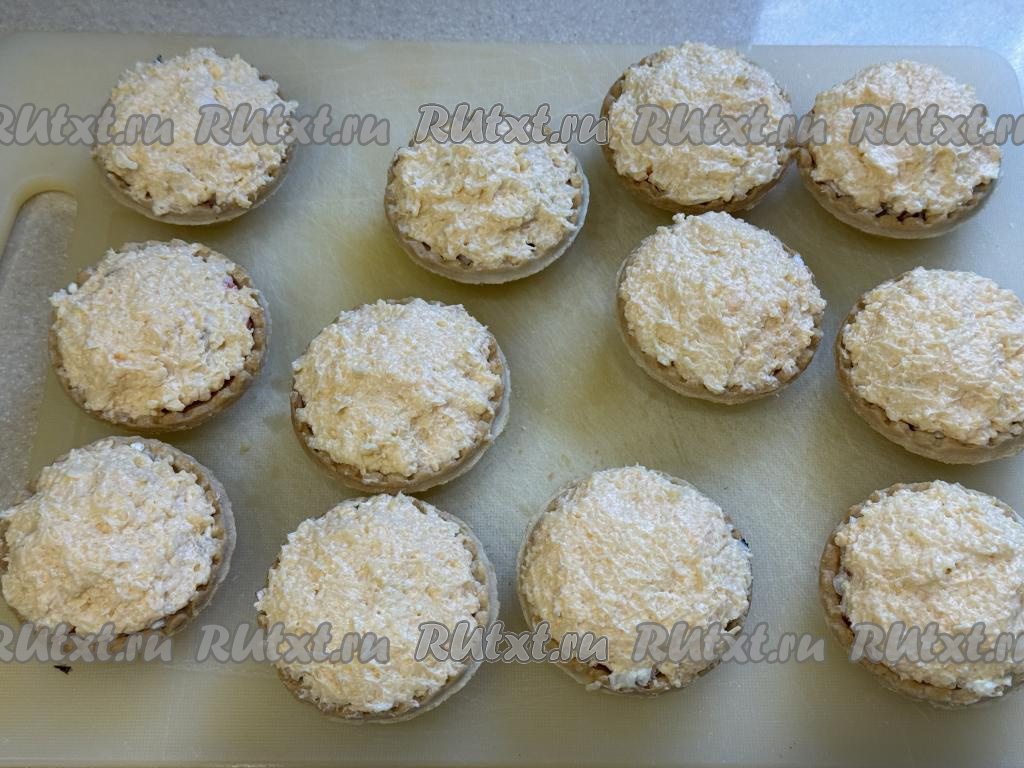 Получившуюся массу с помощью ложки выложить в тарталетки поверх основной начинки в виде сырной шапочки.
