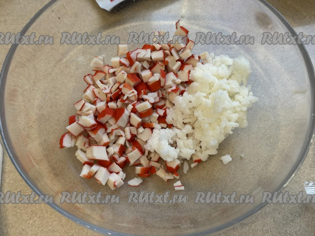Крабовые палочки освободить от упаковки, мелко нарезать. В миске соединить варёный рис и нарезанные крабовые палочки.