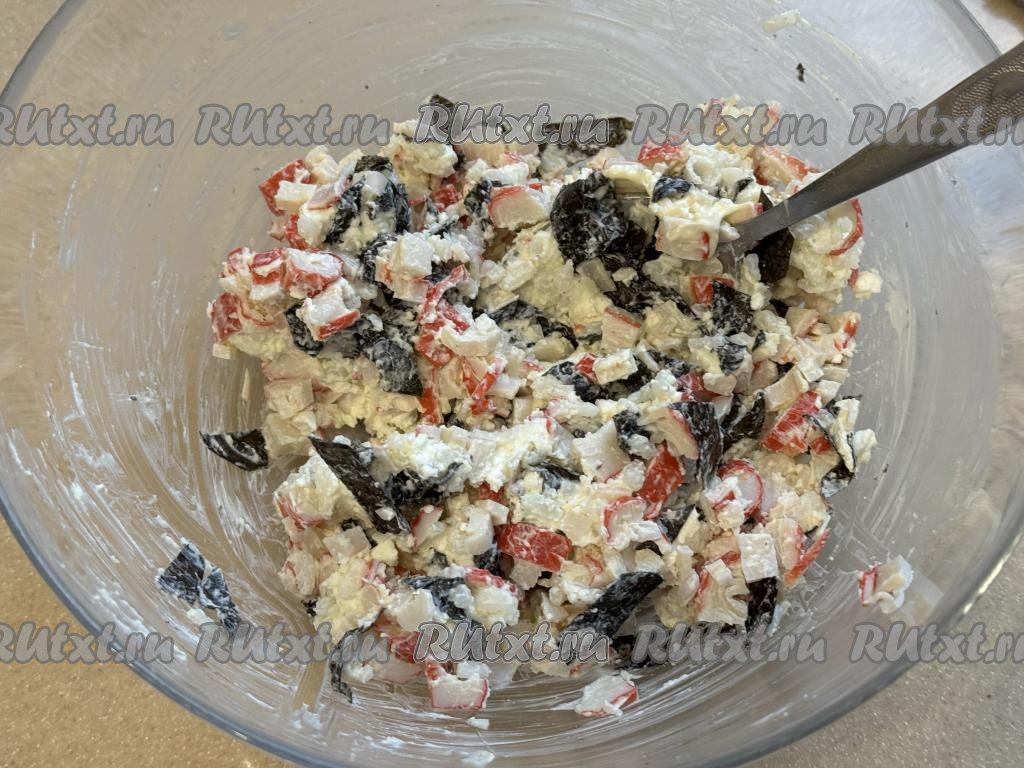 Перемешать смесь икры и сыра столовой ложкой до однородности.
