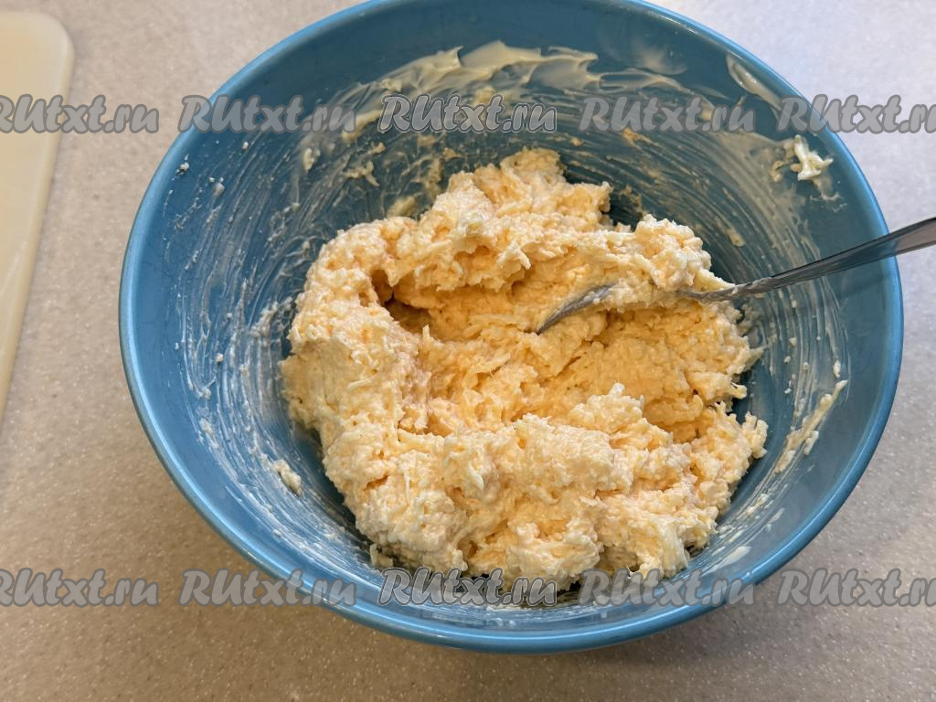 Перемешать массу столовой ложкой до однородности.
