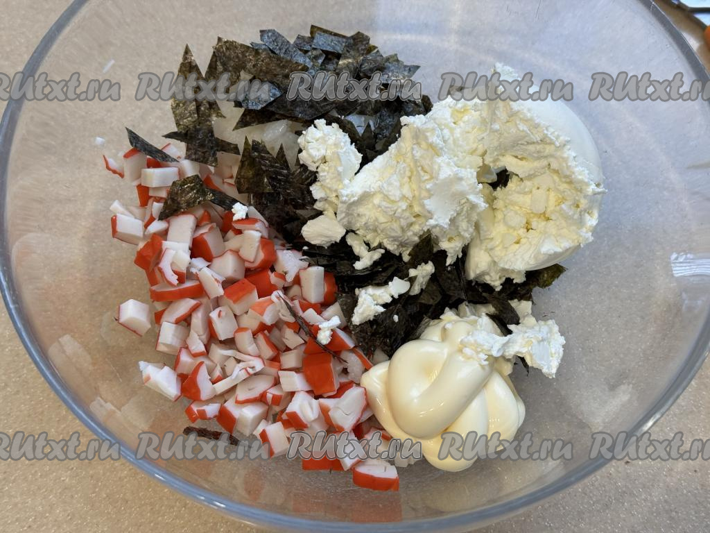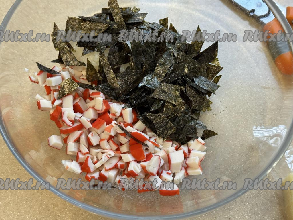Листы нори нарезать ножницами на небольшие кусочки и добавить в миску с крабовыми палочками и рисом.