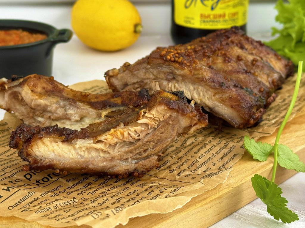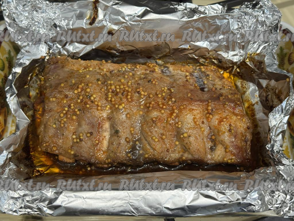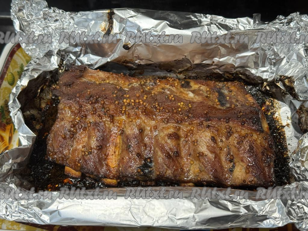 Вот такие свиные рёбрышки, запечённые с соевым соусом и горчицей в фольге в духовке, у меня получились.