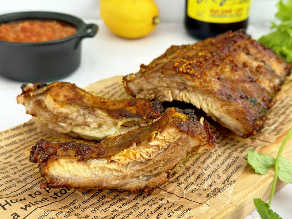Переложить нежные, вкусные, ароматные рёбра на тарелку и подать в горячем виде к столу, дополнив соусом, гарниром и зеленью.