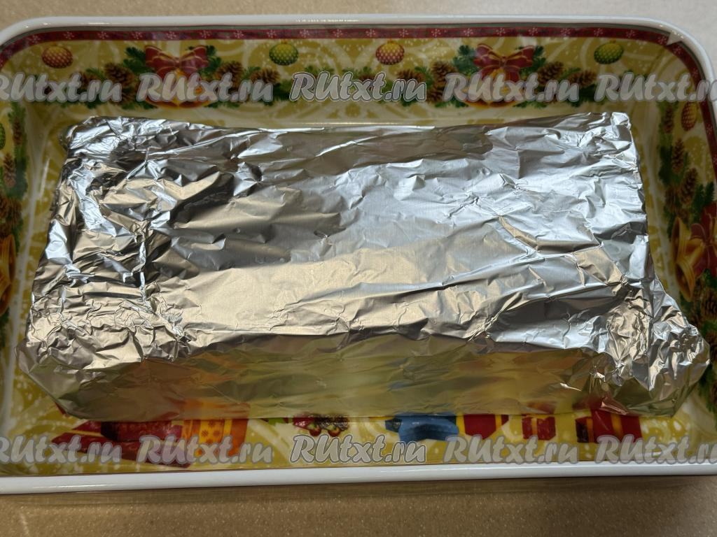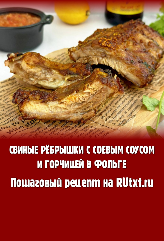 Завернуть мясо в фольгу, свисающую с краёв формы. Запекать свиные рёбрышки с соевым соусом и горчицей в духовке, разогретой до 180 градусов, 1 час.