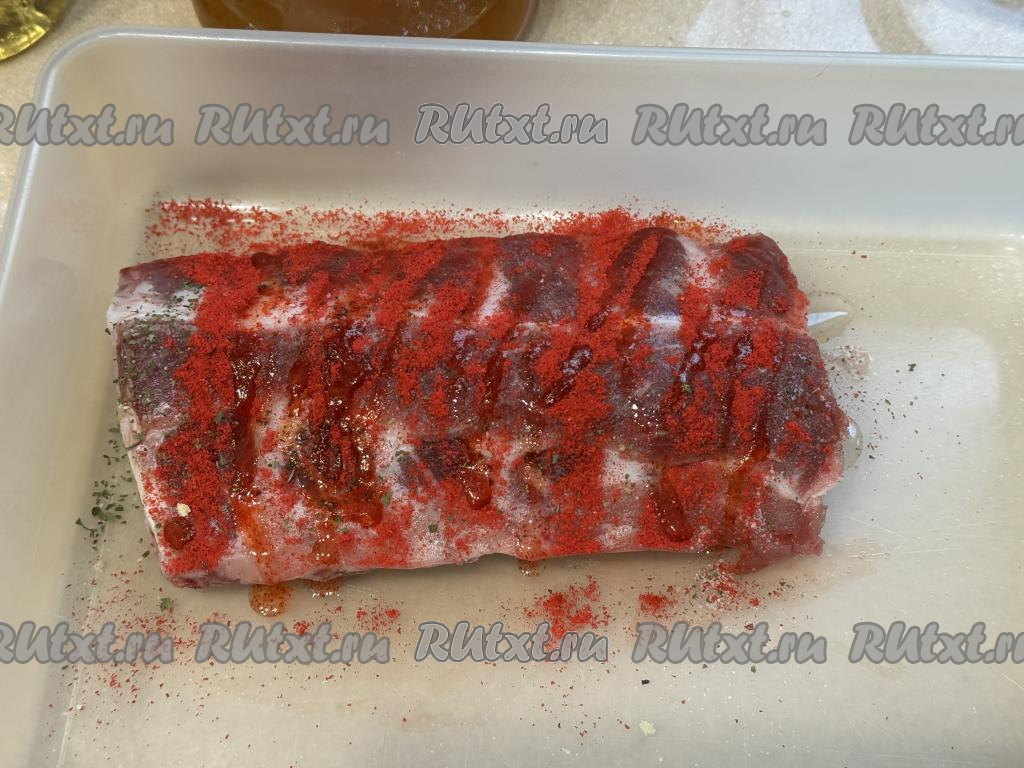 Свиные рёбра я запекала целым куском, но можно взять и рёбрышки нарезанные по кости на порционные части. Рёбра промыть водой, обсушить. Выложить ребрышки в удобный лоток с крышкой, в котором в дальнейшем вы будете мариновать мясо. Посыпать рёбра специями (в качестве специй я использовала 1 чайную ложку паприки) и солью (добавляя соль, обязательно учитывайте степень солёности соевого соуса, который вы будете использовать в дальнейшем). Втереть соль и специи в рёбрышки со всех сторон.