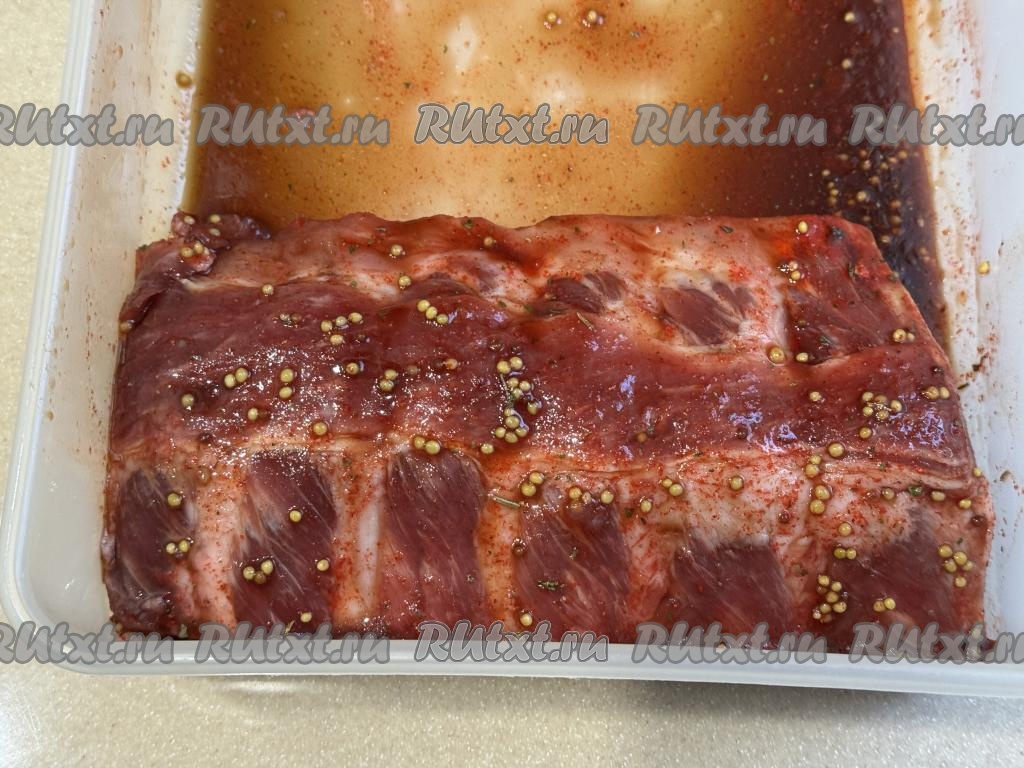 Лоток со свиными рёбрами закрыть крышкой и отправить мясо мариноваться в холодильник, как минимум, на 3 часа (можно и на ночь). Для того чтобы рёбрышки равномерно промариновались со всех сторон, их 3-4 раз нужно будет доставать, переворачивать и снова отправлять в холодильник.