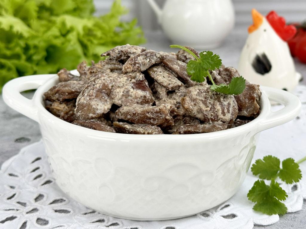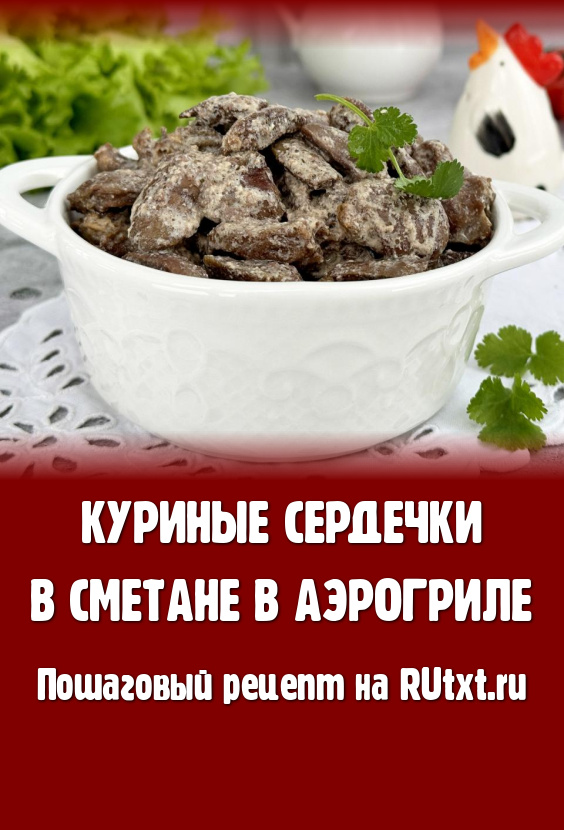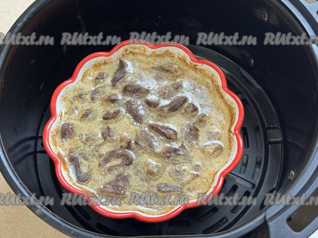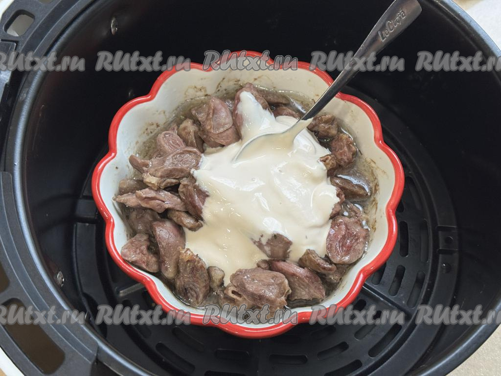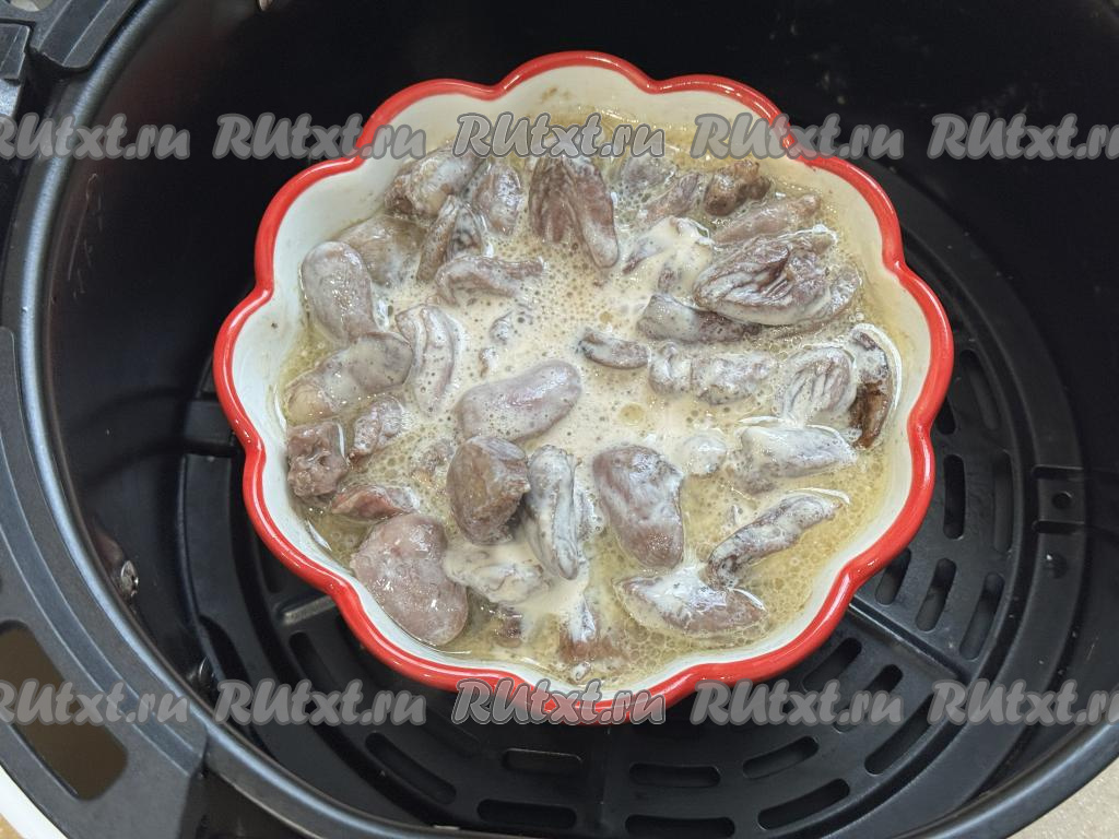 По истечении 20 минут достать чашу из аэрогриля, в форму с куриными сердечками добавить сметану.