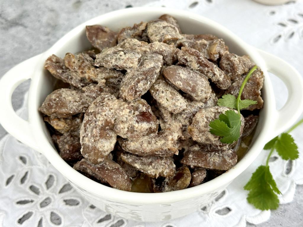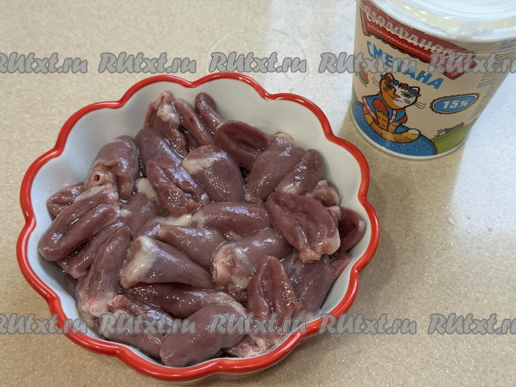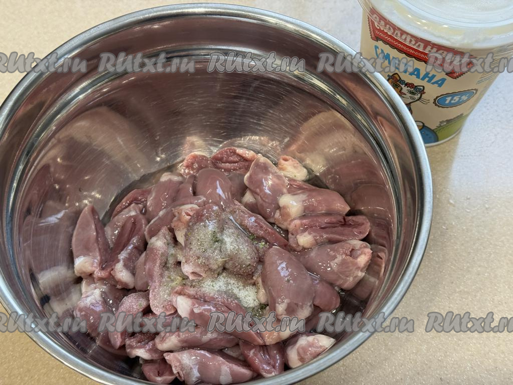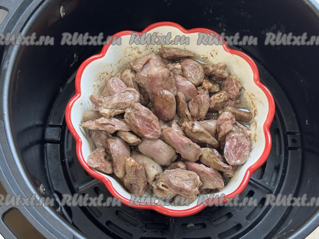 По истечении 20 минут достать чашу из аэрогриля, в форму с куриными сердечками добавить сметану.