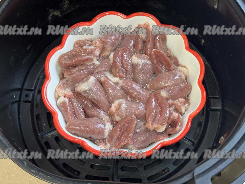 Установить форму с сердечками на решётку аэрогриля, отправить чашу в аэрогриль. Выставить температуру 160 градусов, время - 20 минут. В течение этого времени нужно будет раза 2 достать чашу из аэрогриля и перемешать куриные сердечки в форме.