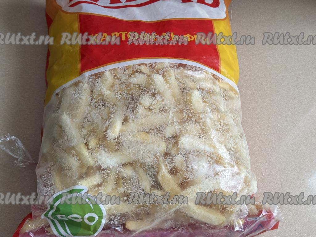 Вот такой замороженный картофель фри я купила. Предварительно размораживать его не нужно.