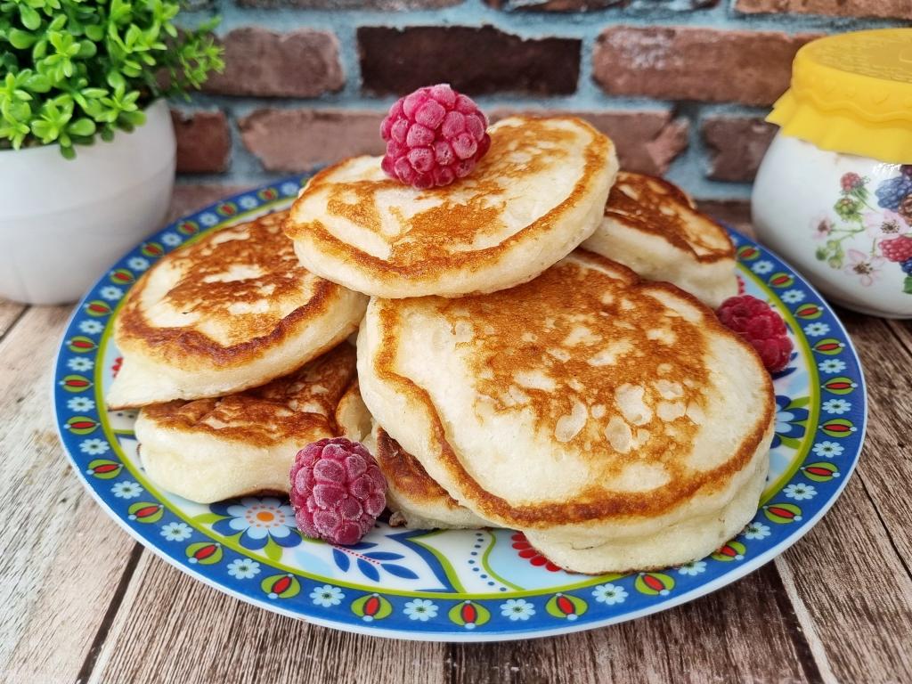Готовые оладьи перекладывать со сковороды на тарелку. Не перемешивая тесто перед жаркой очередной порции оладий и добавляя в сковороду масло по мере необходимости, постепенно пожарить все оладушки. Оладьи, замешанные на греческом йогурте, получаются очень симпатичными, мягкими, нежными, пышными, в меру сладкими.