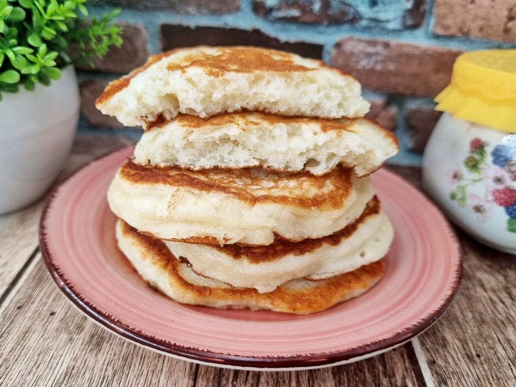 А вот как выглядит в разломе оладушек, приготовленный по этому простому рецепту. Посмотрите, какой у него пышный и воздушный мякиш. Оладьи, замешанные на греческом йогурте, я предпочитаю подавать со сметаной или густым вареньем - это так вкусно!