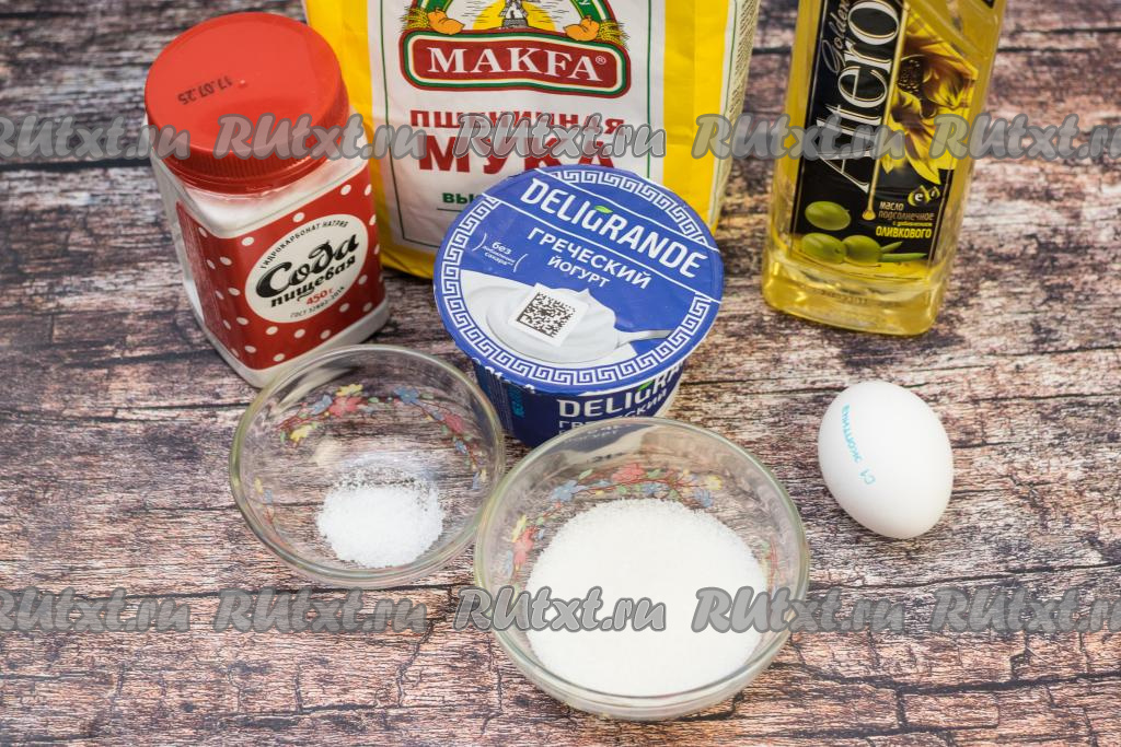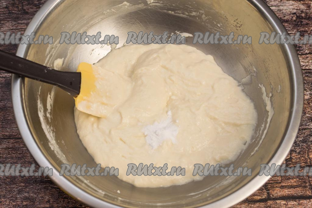 В замешанное тесто всыпать соду, хорошо её вмешать. Оставить тесто на 3-4 минуты, чтобы сода вступила в реакцию с кислой средой греческого йогурта.