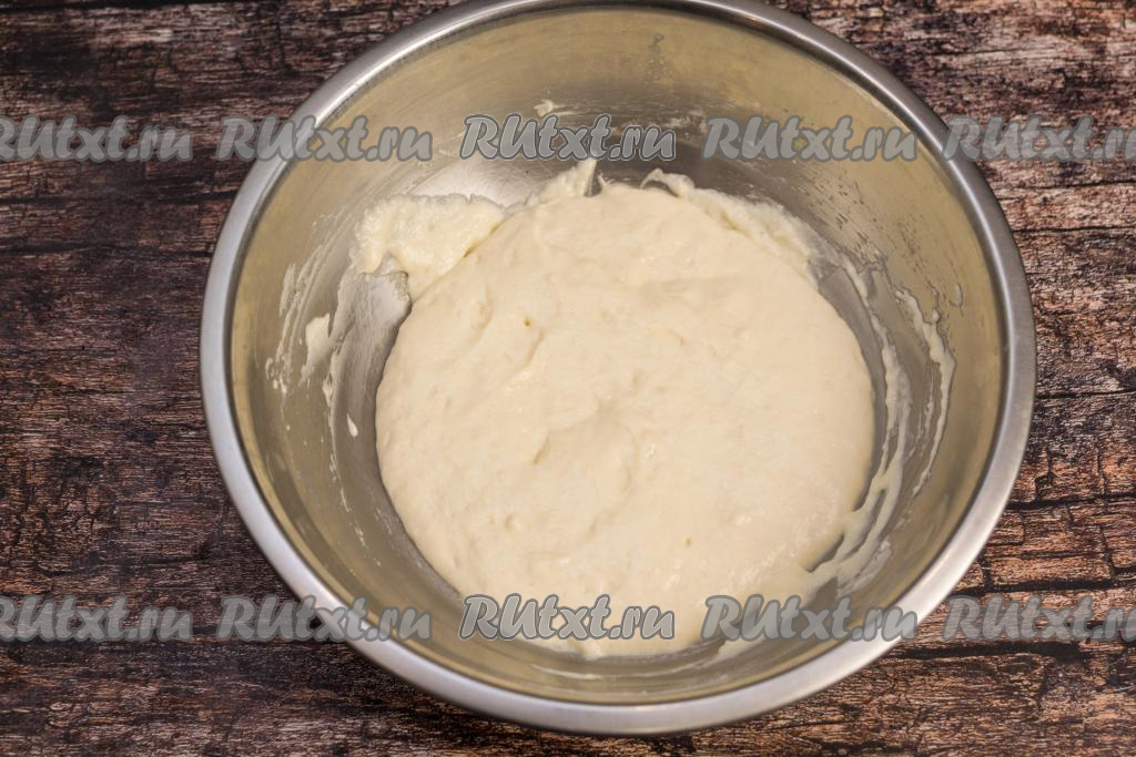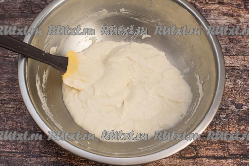 В смесь йогурта и яйца всыпать грамм 60 муки, хорошо перемешать венчиком.