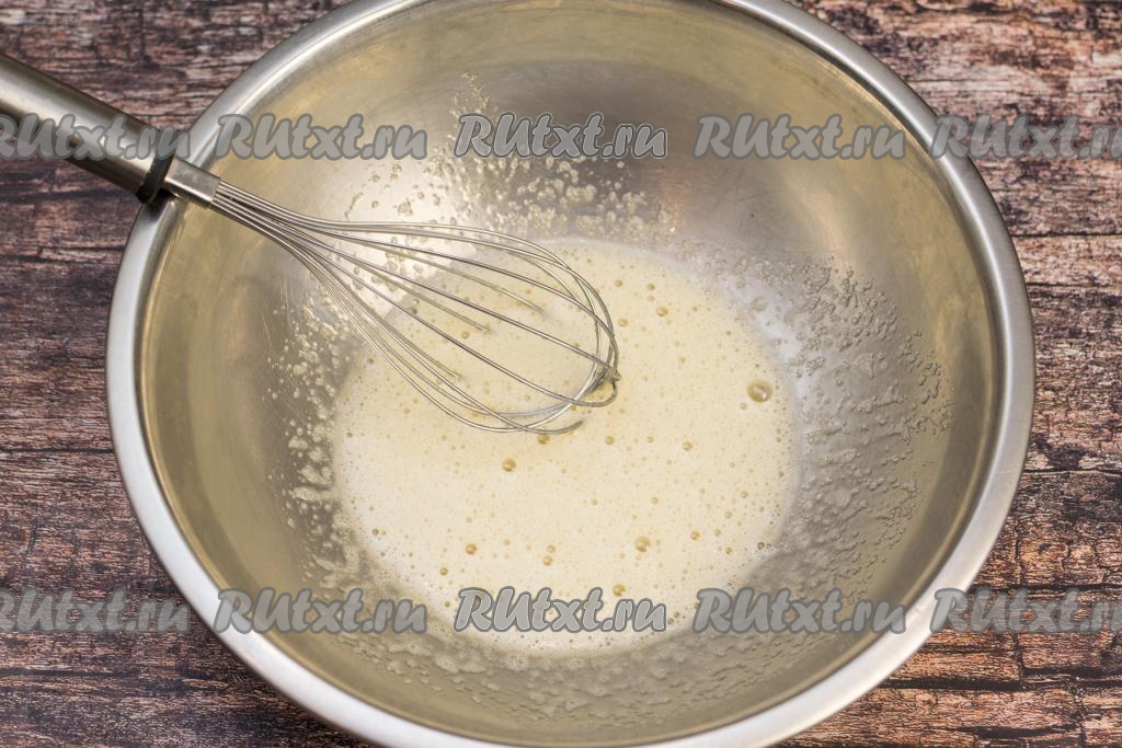 Венчиком энергично перемешать яйцо с солью и сахаром в течение 2 минут (до получения однородной яичной смеси).