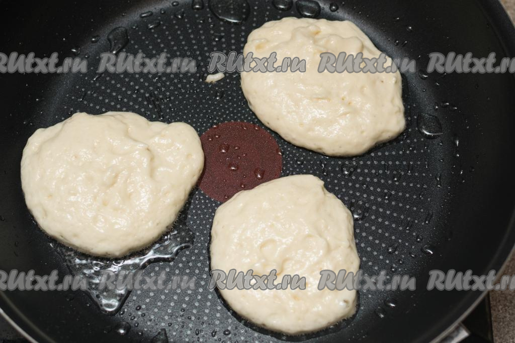 В сковороду влить немного растительного масла, хорошо разогреть, после этого выкладывать по 1 столовой ложке теста в виде округлых оладий.