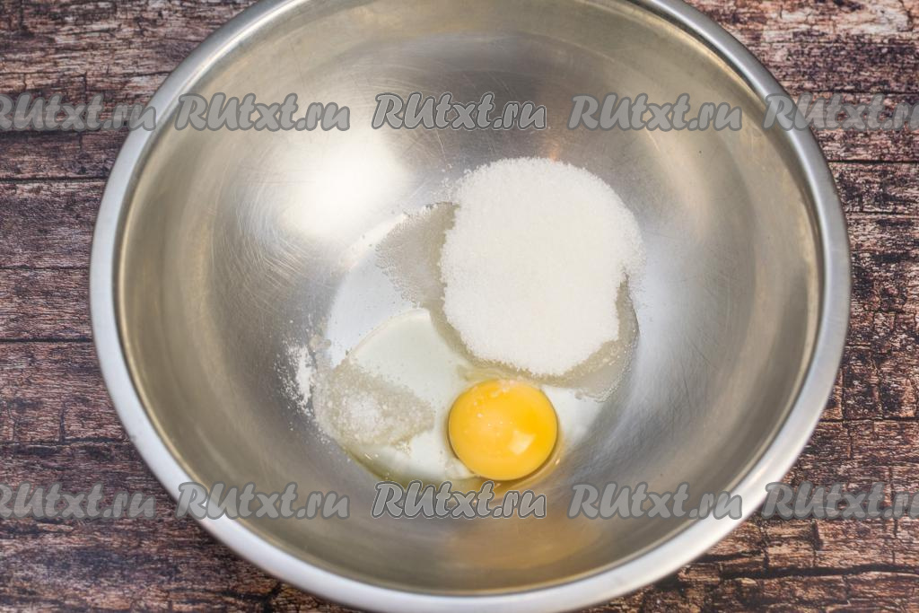 В глубокую миску всыпать соль и сахар, вбить сырое яйцо.
