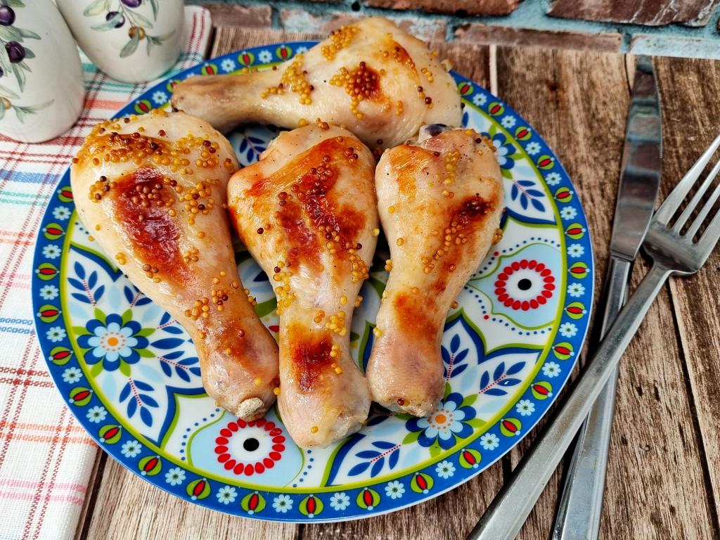 Аппетитные, сочные, очень вкусные, нежнейшие куриные ножки, запечённые в горчично-медовом соусе, достаём из духовки и подаём к столу в горячем виде с любимым соусом и гарниром.
