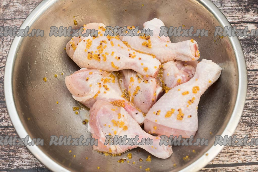 В миску с ножками добавляем горчично-медовый соус. Снова перемешиваем, покрывая ножки соусом со всех сторон. Миску с ножками накрываем и отправляем в холодильник, как минимум, минут на 30. В течение этого времени ножки нужно будет 1-2 раза перемешать, чтобы они хорошо пропитались и мёдом, и горчицей.