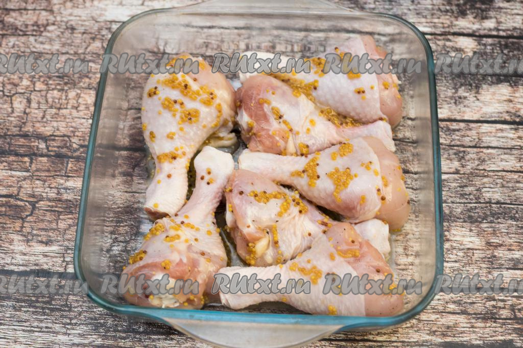 Ножки, замаринованные в медово-горчичном соусе, выкладываем в жаропрочную форму, сверху можно полить ножки соусом, оставшимся от маринования.