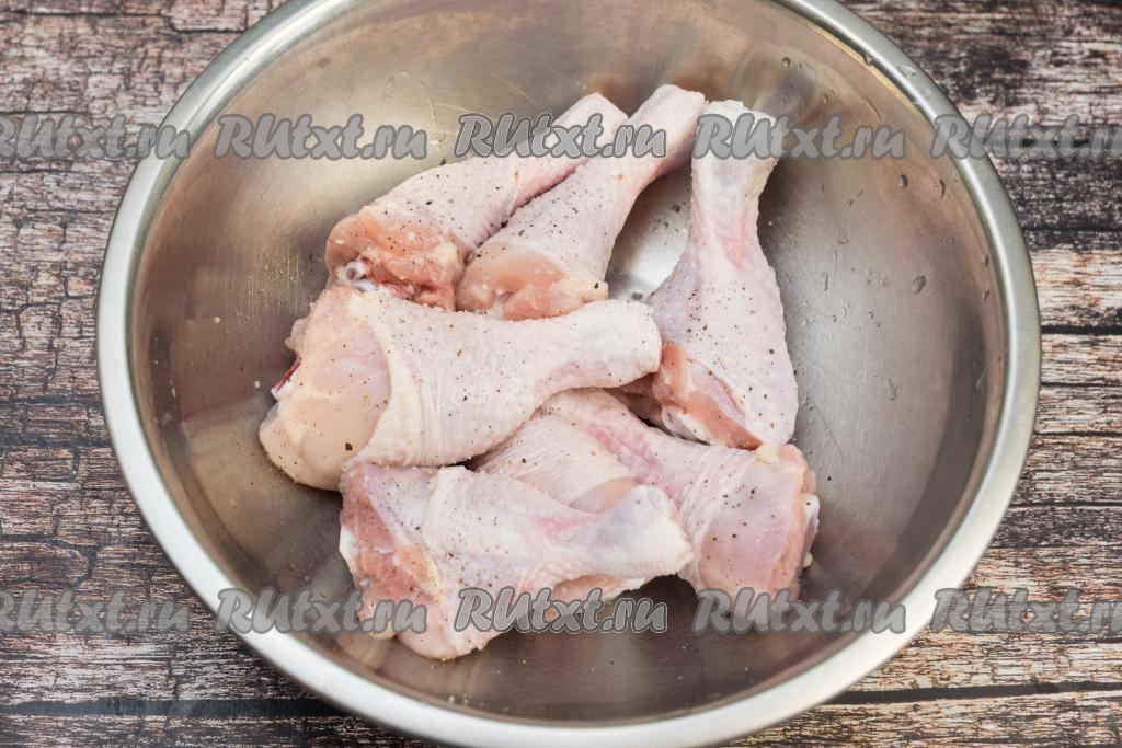 Куриные ножки выкладываем в миску, солим, перчим. Тщательно перемешиваем, втирая руками специи в ножки со всех сторон.