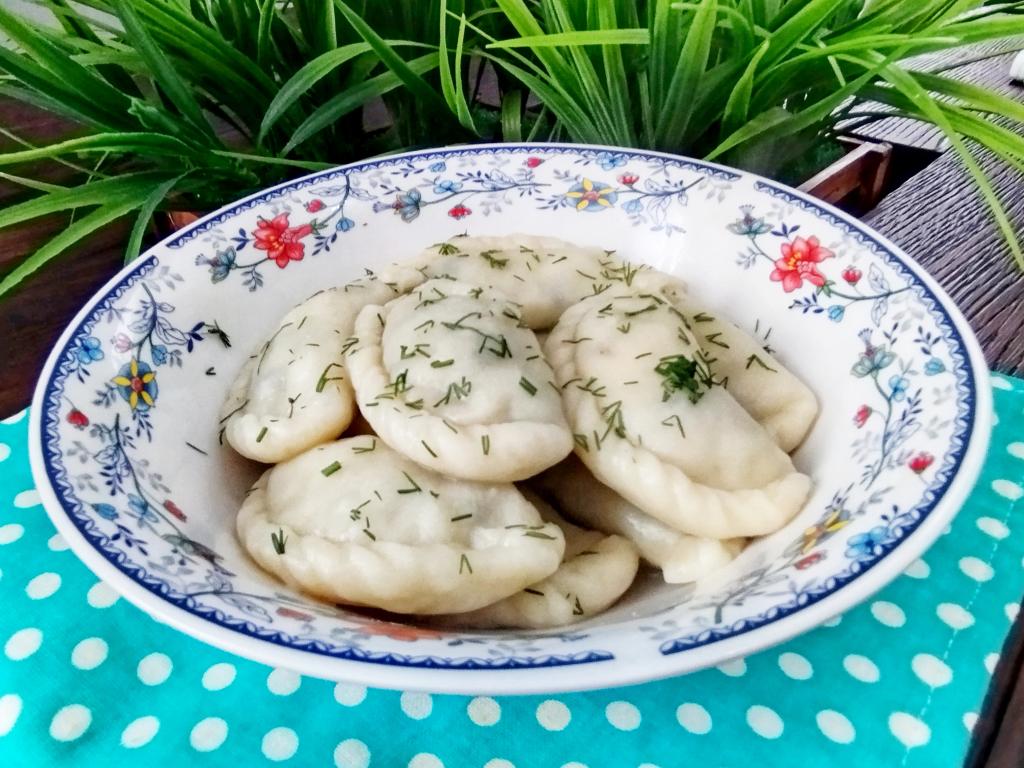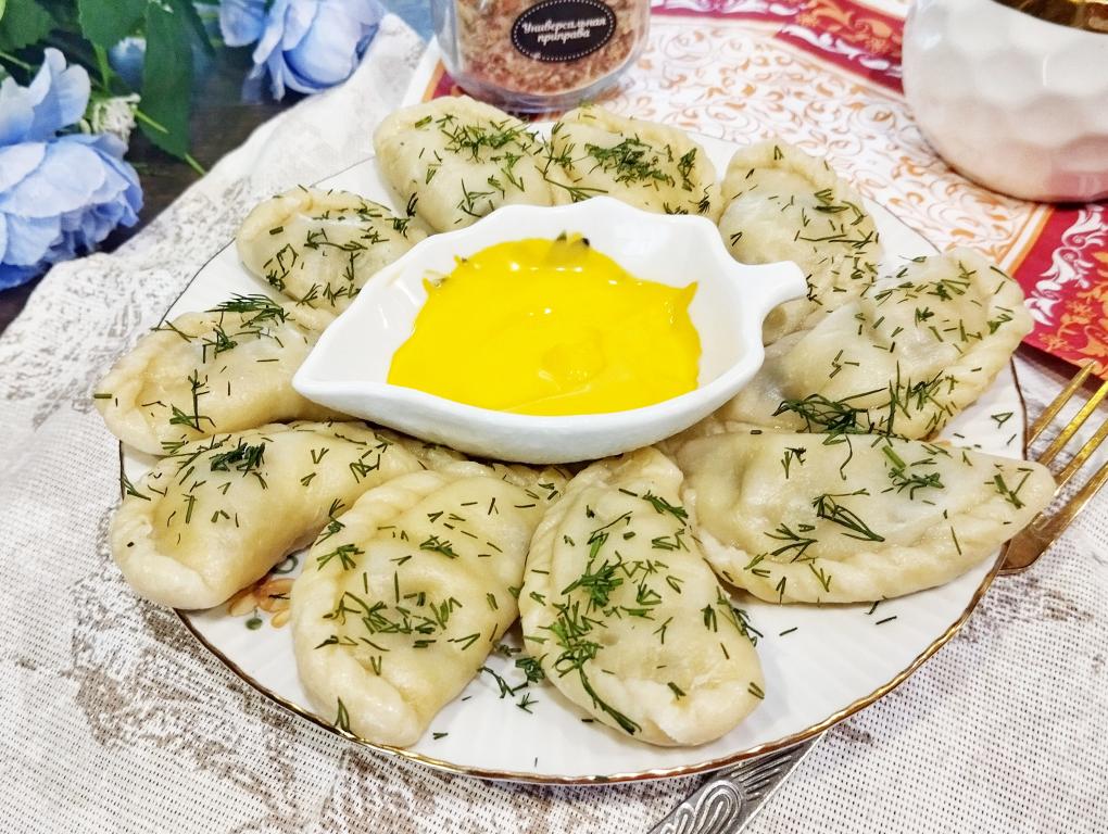 Готовые постные вареники с начинкой из картошки и грибов выкладываем на тарелку и подаём в горячем виде с любимым соусом. Можно дополнительно посыпать варенички свежей зеленью.