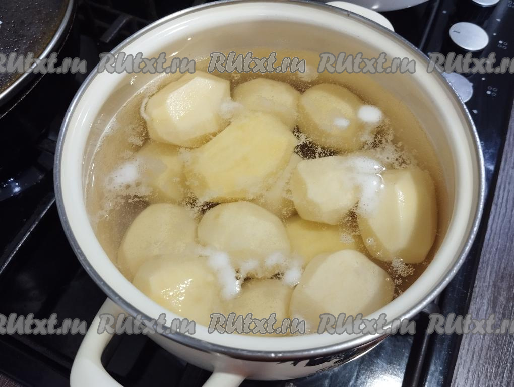 Первым делом очищенный картофель выкладываем в кастрюлю, заливаем полностью водой, солим и отвариваем до готовности (в течение 25-30 минут с момента закипания воды, готовые картошины будут легко прокалываться ножом).