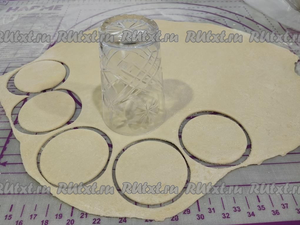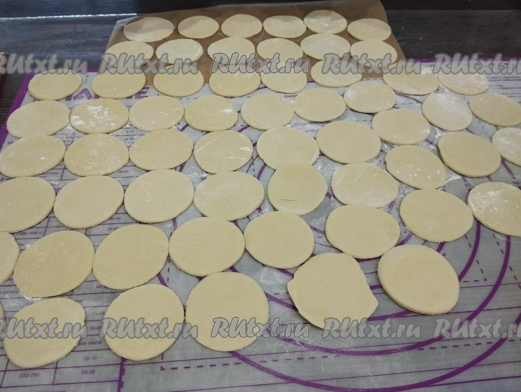 Остатки теста снова собираем в ком, раскатываем и тоже вырезаем из него кружочки. Я вырезала кружочки диаметром 7 сантиметров, в результате у меня получились 59 кружочков.