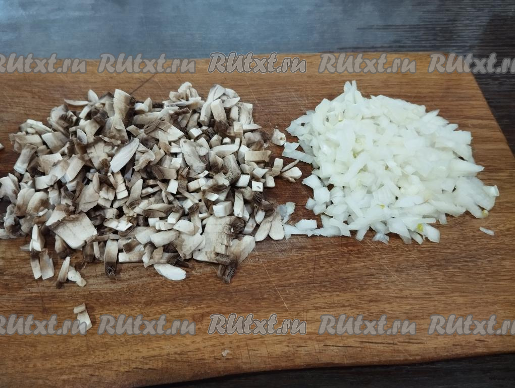 Пока отваривается картошка, нарезаем мелко лук и шампиньоны.