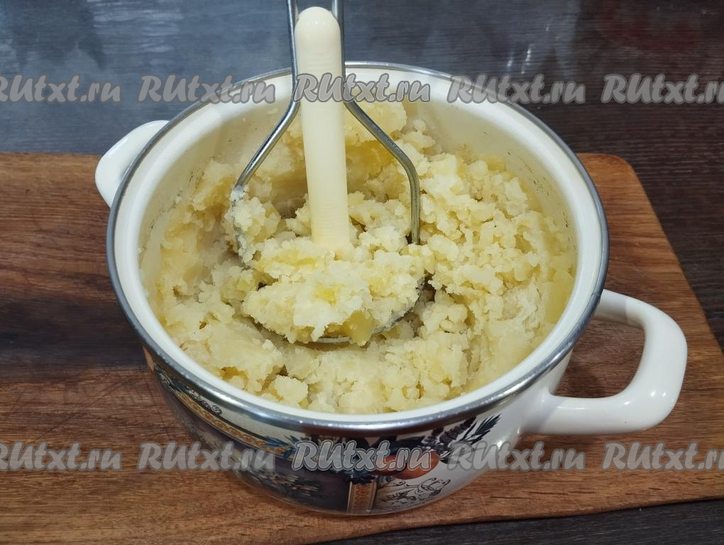 Кастрюлю со сварившейся картошкой убираем с огня. Всю воду, в которой варился картофель, из кастрюли сливаем. Разминаем картошку толкушкой до состояния пюре.