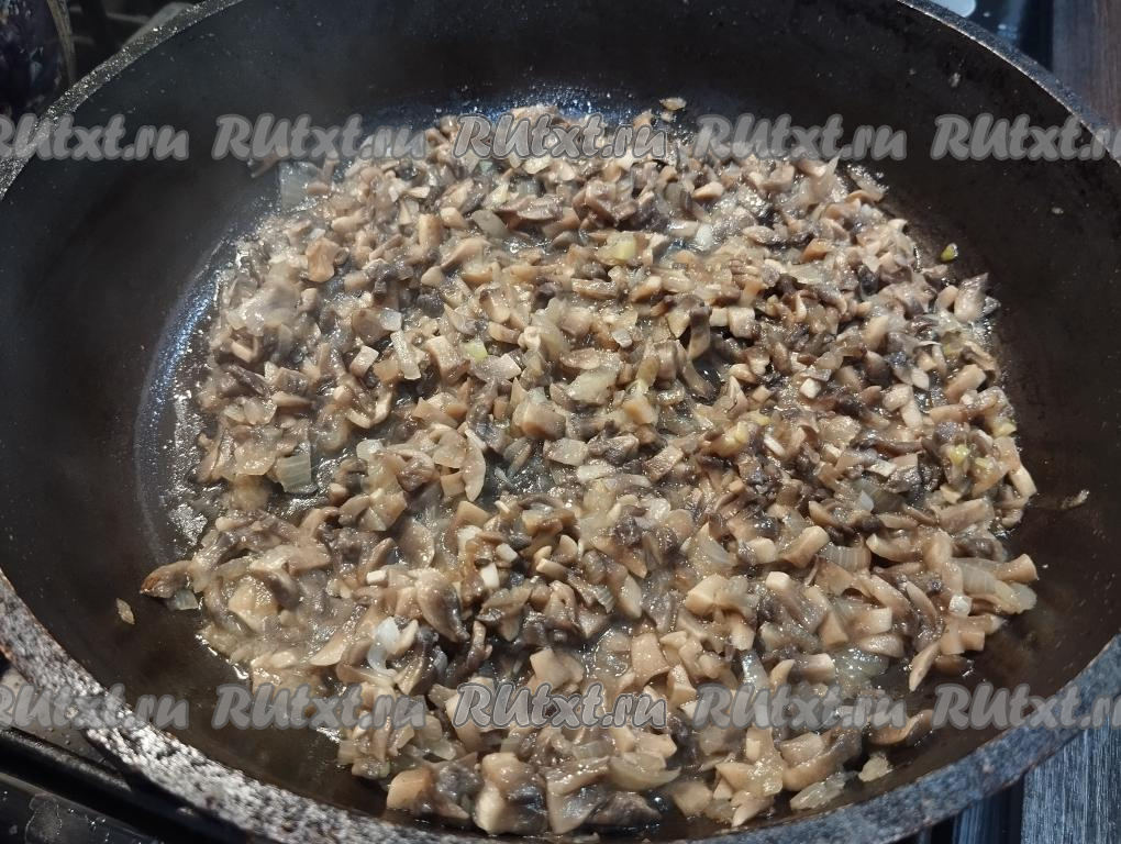 Сковороду хорошо разогреваем с добавлением растительного масла. Обжариваем грибы и лук на среднем огне до испарения жидкости (ориентировочно в течение 9-10 минут), иногда помешивая. Солим по вкусу.