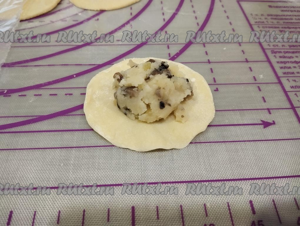 В центр каждого кружочка выкладываем 1 чайную ложку начинки из грибов и картошки.