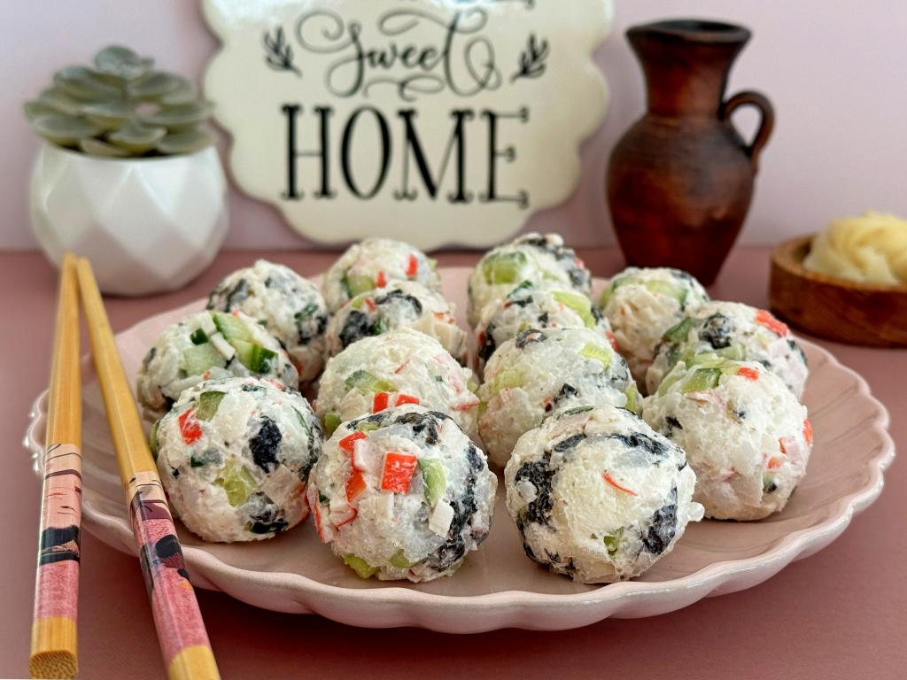 Аппетитные, вкусные ленивые суши-шарики с крабовыми палочками при подаче можно дополнить соевым соусом.