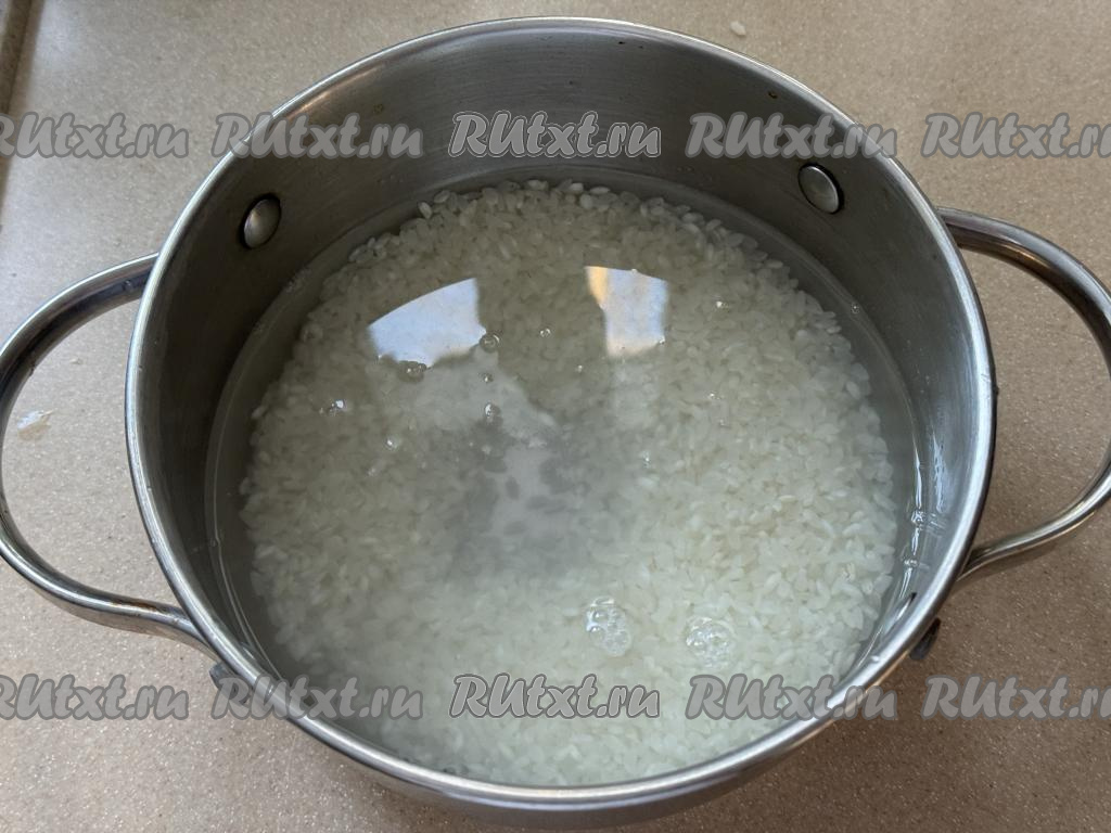 Прежде всего нужно сварить рис. Для этого рис нужно выложить в сито, хорошо промыть под проточной водой, убирая с риса крахмал. Лишней воде дать с риса стечь. В кастрюле вскипятить воду, подсолить, выложить подготовленный рис, перемешать, дать закипеть, уменьшить огонь, варить до готовности риса (минут 20-25, рисинки должны стать мягкими, но не переваренными). Сварившийся рис откинуть на сито, оставить на несколько минут, чтобы лишняя вода стекла и рис остыл.