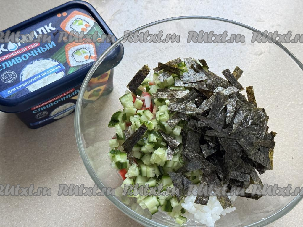 Листы нори нарезать кухонными ножницами на небольшие кусочки и вместе с огурцом выложить в миску с рисом и крабовыми палочками.