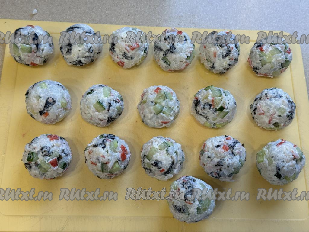 Сформировать суши-шарики весом примерно по 25 грамм. Чтобы масса не прилипала к рукам, можно периодически смачивать руки водой или формировать шарики в перчатках. У меня получились 17 шариков.