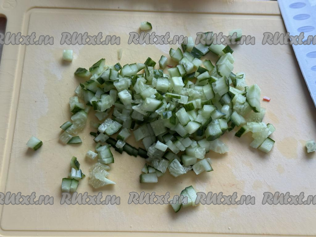 Огурец вымыть, обрезать кончики с двух сторон. Нарезать огурец на мелкие кубики.
