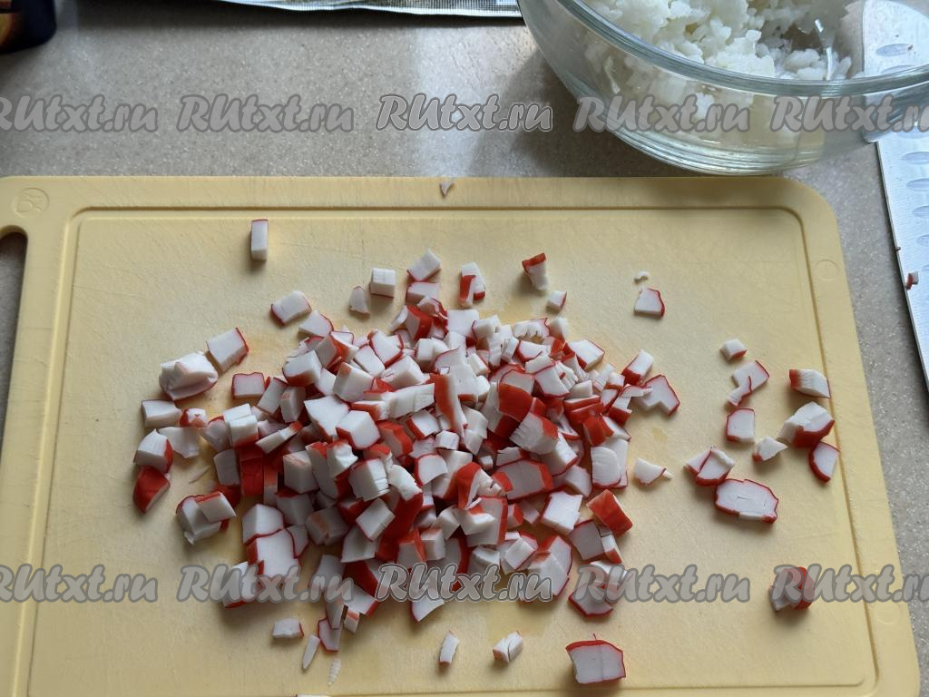 В глубокую миску выложить остывший рис и нарезанные крабовые палочки.