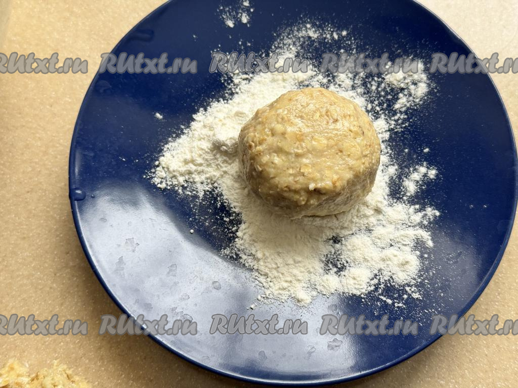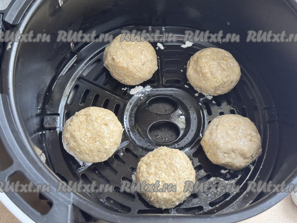 По прошествии получаса из получившегося теста сформировать влажными руками небольшие шарики весом примерно по 40 грамм. Я сформировала 13 шариков. В глубокую миску всыпать 1 столовую ложку пшеничной муки. Шарик из овсяного теста слегка приплюснуть и одной стороной окунуть в муку. Обмакивать в муку нужно столько шариков из слоёного теста, сколько у вас одновременно поместятся в чашу аэрогриля.