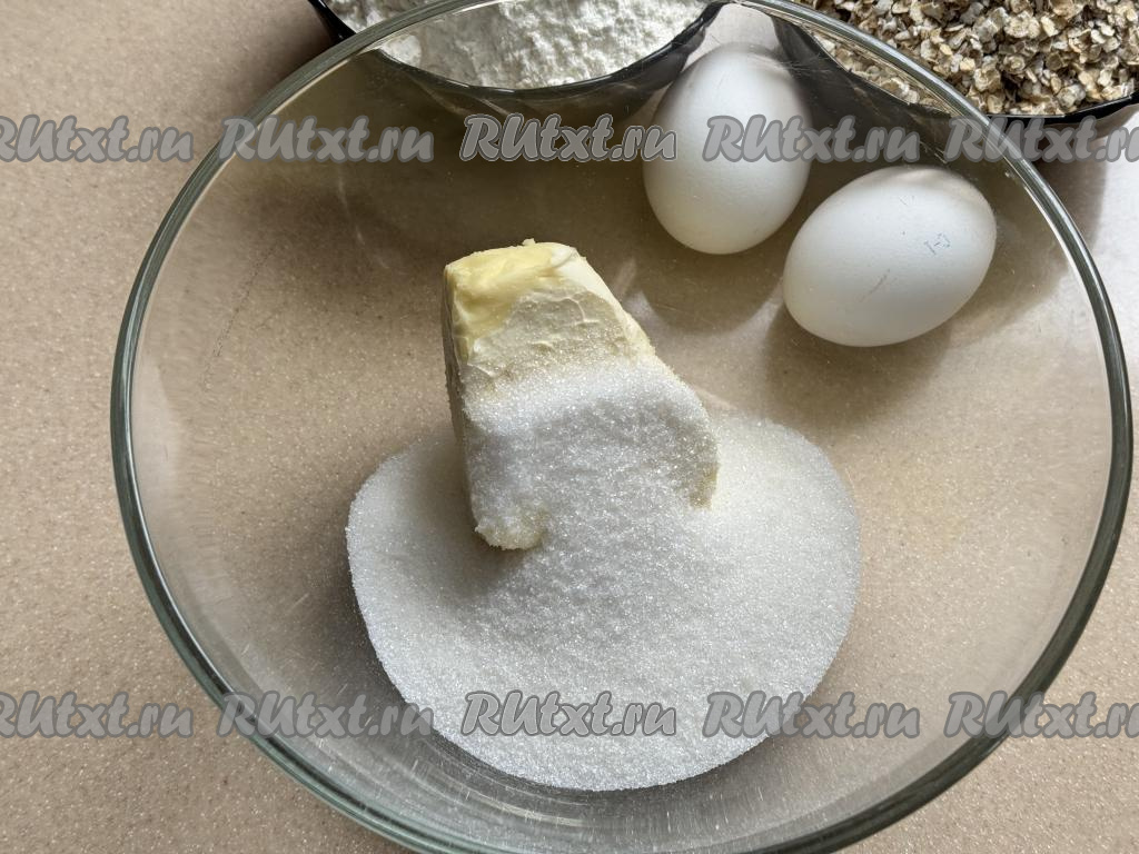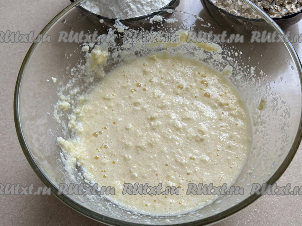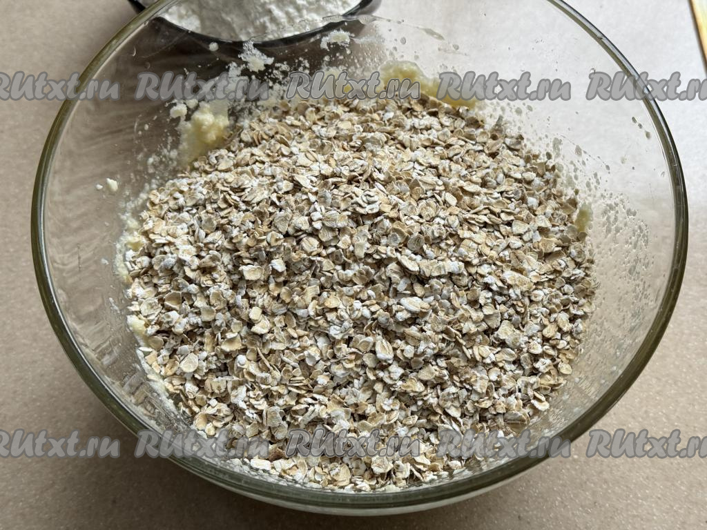 В миску с масляно-яичной массой всыпать овсяные хлопья.
