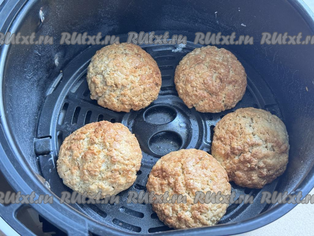 Переложить заготовки овсяного печенья на решётку аэрогриля так, чтобы сторона, припылённая мукой, была снизу. Выкладывать нужно печенье на небольшом расстоянии друг от друга. У меня всё печенье сразу не поместилось в аэрогриль, я выпекала его в несколько заходов. Отправить чашу в аэрогиль.