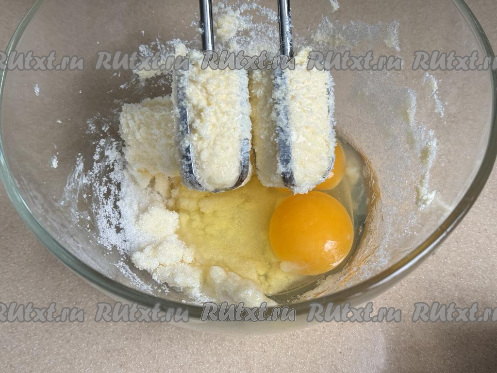 Взбить масло с сахаром миксером в течение 5 минут. Затем добавить яйца по одному, взбивая яично-масляную массу до однородности после добавления каждого яйца.
