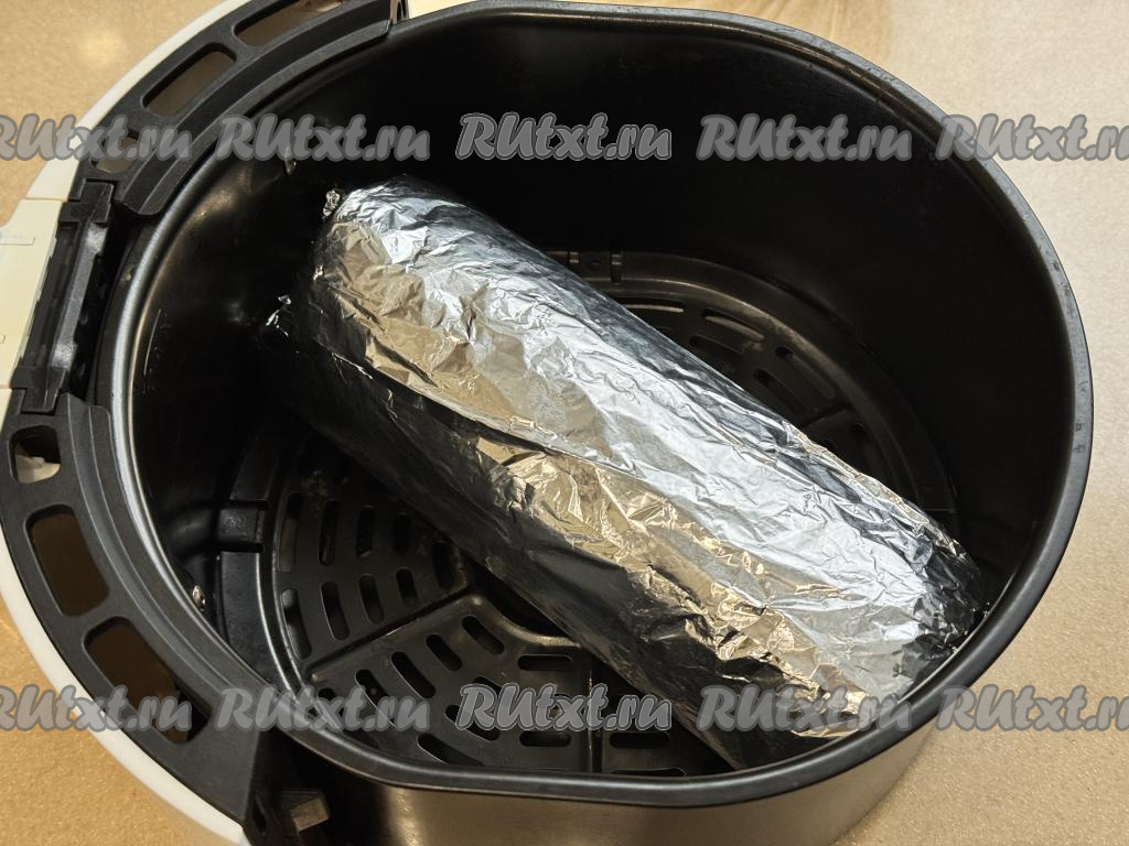 Рулет из фарша с яйцом, завёрнутый в пергамент, завернуть в лист фольги. Закрутить края фольги с двух сторон. Рулет, завёрнутый в фольгу, будет напоминать конфету, выложить его на решётку в чашу аэрогриля. Отправить чашу в аэрогриль.