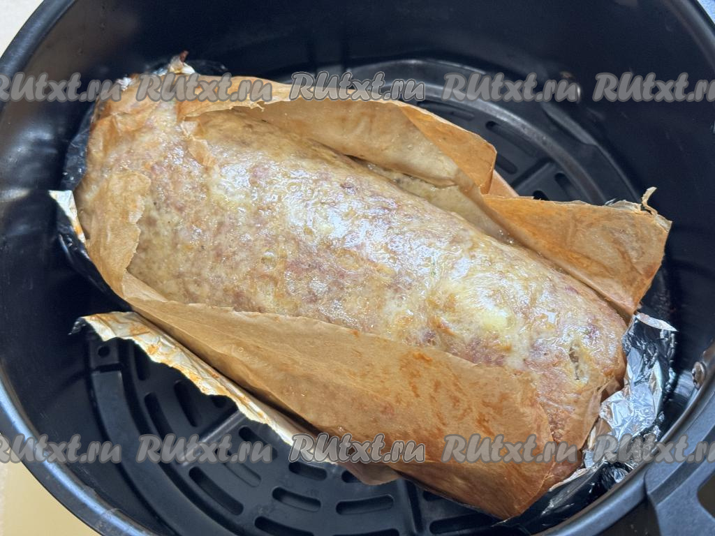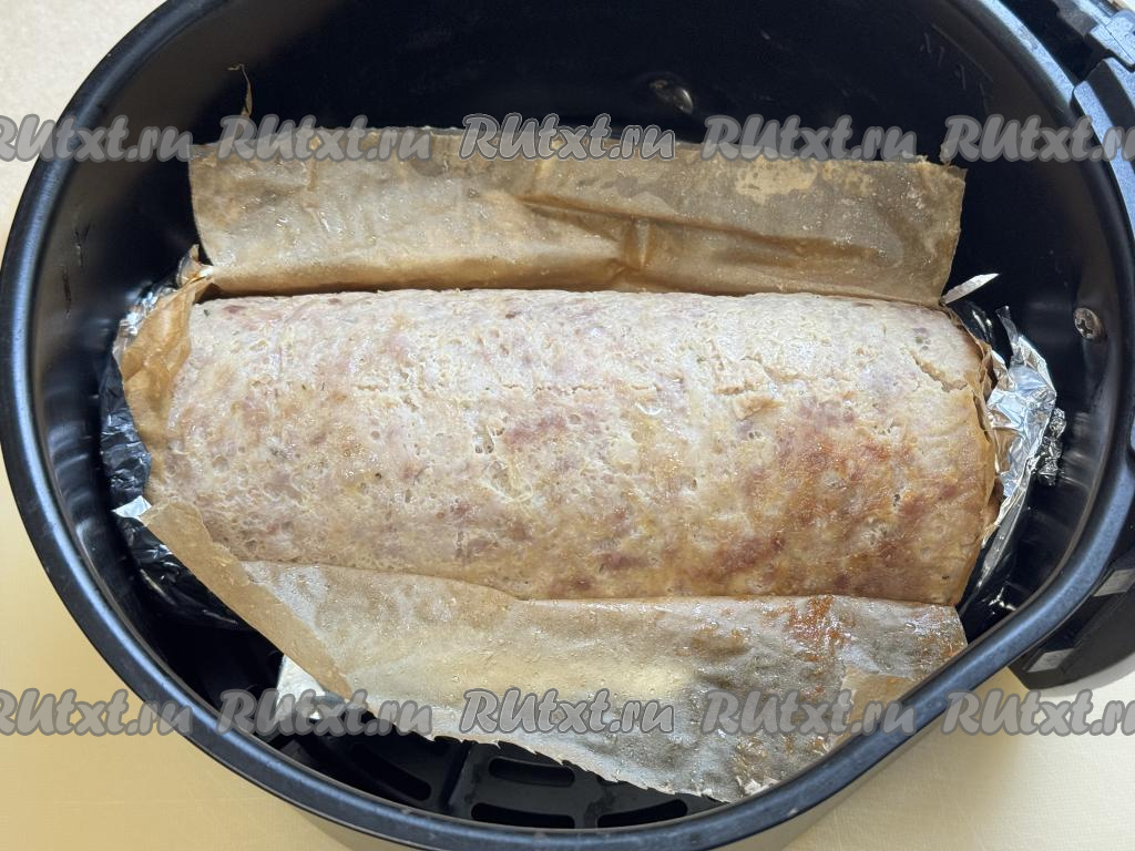 Запекать рулет в аэрогриле ещё 10 минут при температуре 160 градусов.
