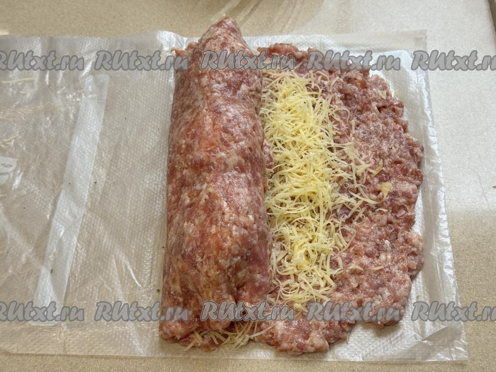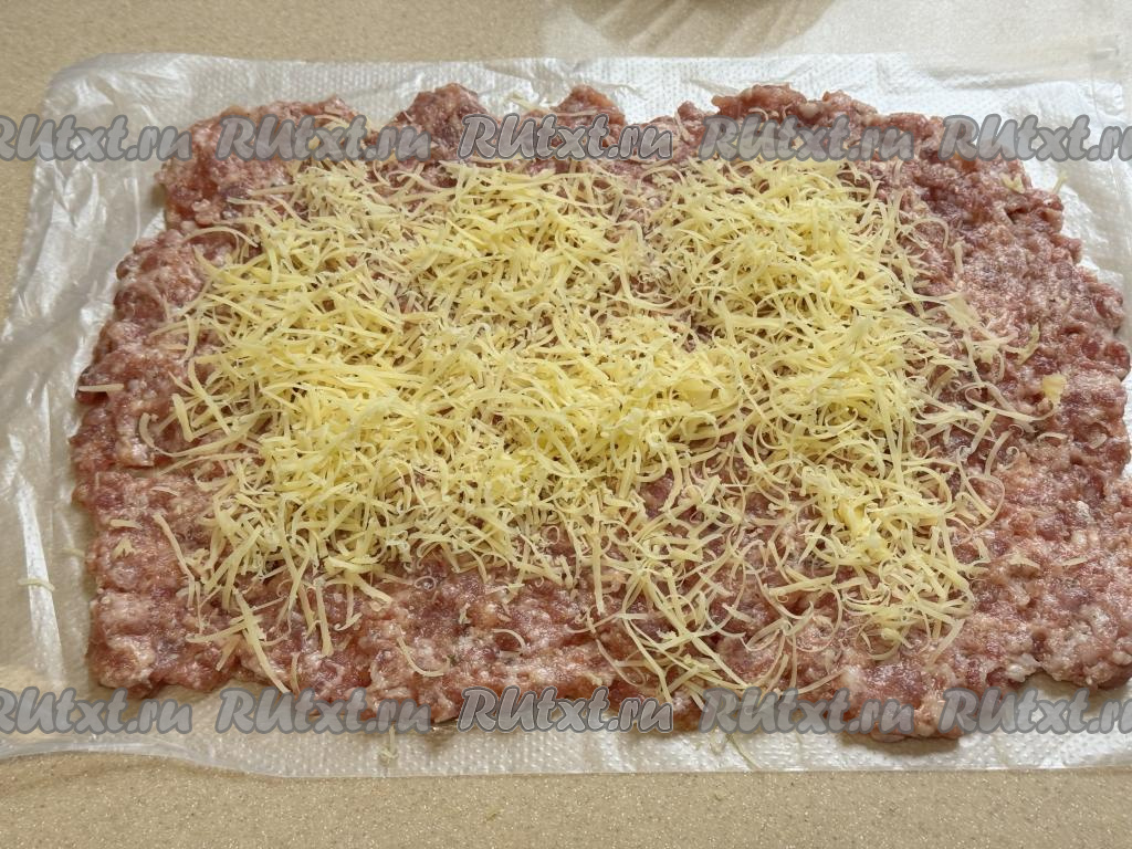 Сыр натереть на мелкой тёрке. Отступая от одного узкого и двух широких краёв пласта из фарша по 1 сантиметру, а от второго узкого пласта - 2 сантиметра, посыпать фарш натёртым сыром.