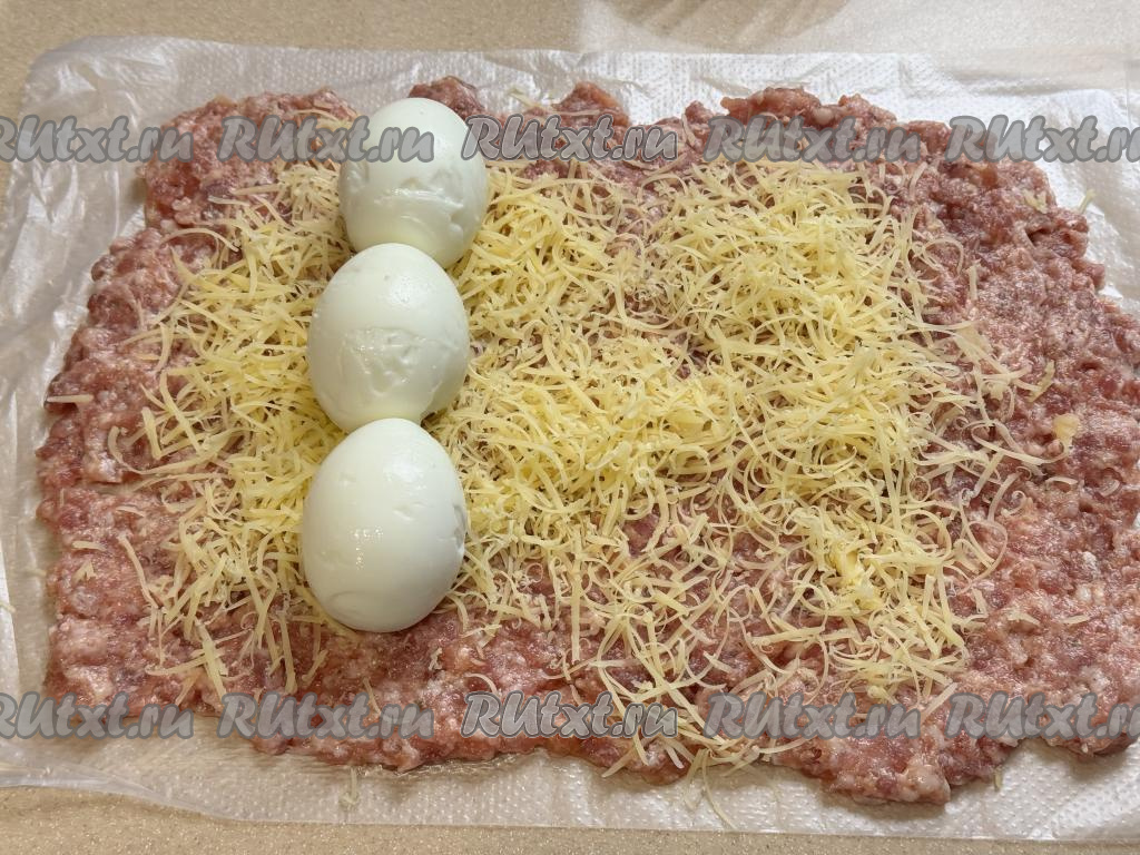 Отступив от узкого пласта фарша, посыпанного сыром, сантиметра 2-3, выложить в ряд варёные яйца, как на фото.