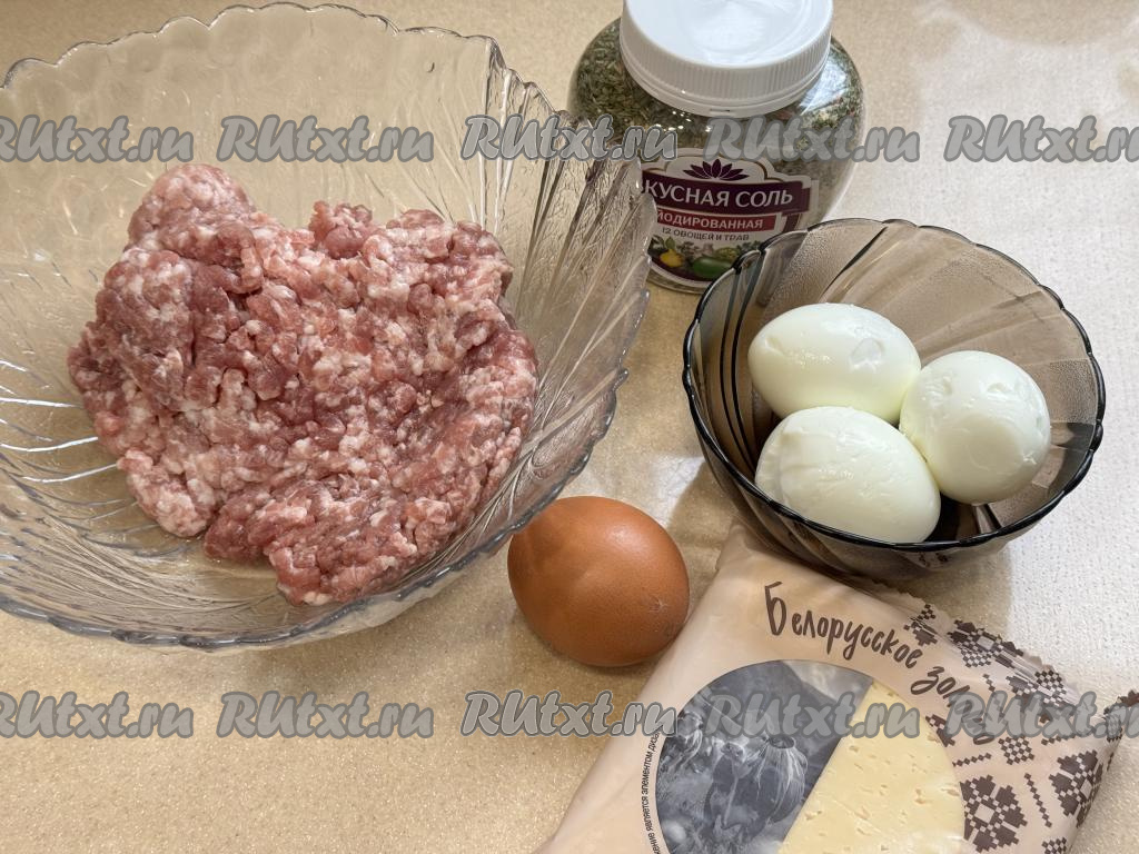 Подготовить продукты. Для формирования рулета можно взять как покупной фарш, так и фарш из любого мяса (у меня - свинина), пропущенного через мясорубку. 3 яйца отварить в течение 10 минут с момента закипания воды, затем остудить их и очистить от скорлупы.