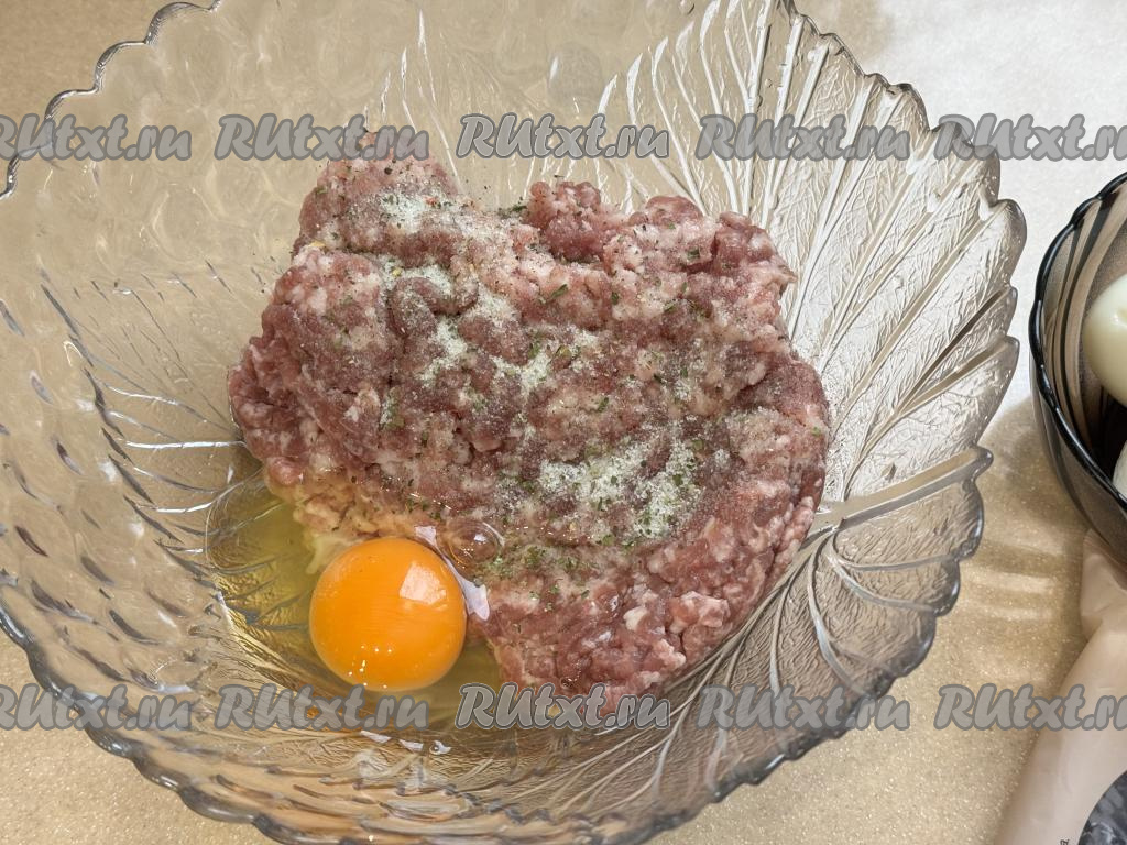В миску выложить фарш, добавить 1 сырое яйцо, всыпать соль и чёрный молотый перец. Тщательно перемешать фарш.