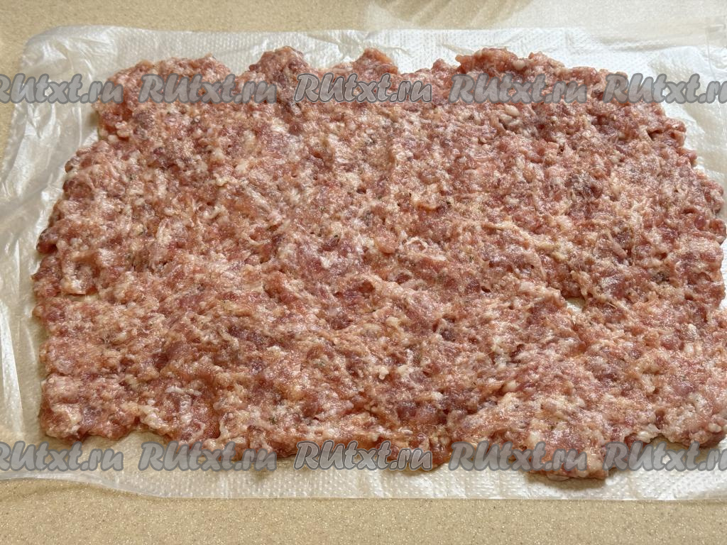 На столе расстелить целлофановый пакет, на него выложить фарш и распределить его в пласт толщиной чуть меньше 1 сантиметра.