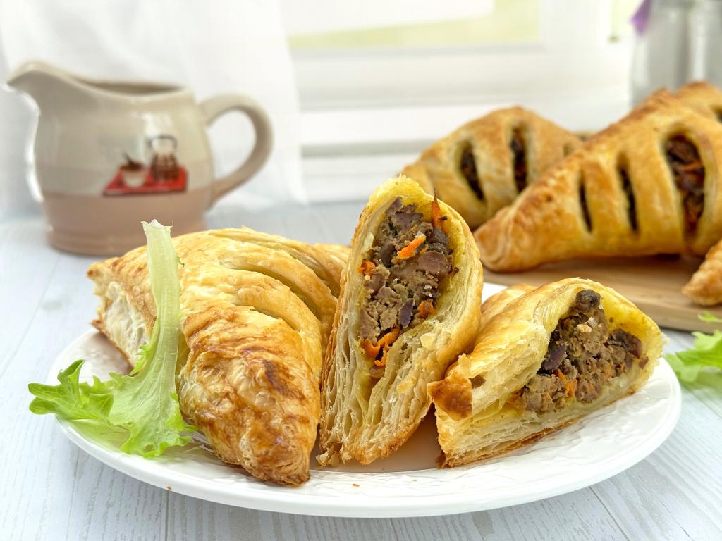 А вот как эти вкусные, аппетитные слойки с печенью выглядят в разрезе. В них отлично сочетается большое количество нежной начинки и воздушное слоёное тесто.